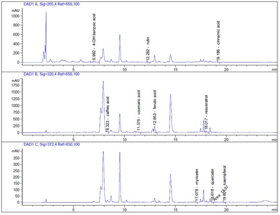 Quantification of bioactive compounds from the microgreens of Lepidium sativum L. was performed using Agilent 1260 Infinity high-performance liquid chromatography (Agilent Technologies, Waldbronn, Germany) with a quaternary solvent manager coupled with a diode array detector (G1315C), degasser (G1311B), sample (G1329B), and column (G1316A) manager. Harvested Lepidium sativum L. was used to analyze the phenolic compounds, and during the analysis, the DAD collected data in the UV range of 210–400, in steps of 1 nm; while we used the following quantification wavelengths for individual analytes: 265 nm: 4-OH benzoic acid; 320 nm: caffeic acid; trans p-coumaric acid, ferulic acid, resveratrol, cinnamic acid; and 372 nm: myricetin, quercetin and kaempferol. One gram of the microgreen sample was dissolved in methanol (HPLC grade; 80%; Sigma-Aldrich, St. Louis, MO, USA), and the mixture was horizontally shaken (Unimax 2010; Heidolph Instrument, GmbH, Germany) at 25 °C, and 250 rpm for 8 h. Afterwards, the sample was filtered (84 g/m2 filter paper, Munktell, Germany) and extracted in 10 mL of 80% (v/v) methanol with a horizontal shaker. Before use, the standard solutions and the extract were filtered through a Q-Max syringe filter (0.22 mm, 25 mm; Frisenette ApS, Knebel, Denmark). For HPLC measurements we used selected standards in HPLC grade (4-OH benzoic acid, caffeic acid, trans p-coumaric acid, rutin, ferulic acid, myricetin, resveratrol, quercetin, cinnamic acid, kaempferol) purchased from Sigma-Aldrich, St. Louis, MO, USA, acetonitrile (HPLC grade; Sigma-Aldrich, St. Louis, MO, USA), phosphoric acid (ACS grade; Sigma-Aldrich, St. Louis, MO, USA), and double-deionized water (ddH2O) prepared with a purification system (Simplicity 185; Millipore SAS, Molsheim, France). HPLC measurements were performed on a Purosphere reverse phase C18 column (Merck, Darmstadt, Germany). The mobile phase D (acetonitrile) and the mobile phase C (0.1% phosphoric acid in ddH2O) were included in the mobile phase. The gradient elution was as follows: 0-1 min isocratic elution (90% C and 10% D), 1–6 min linear gradient elution (85% C and 15% D), 6–12 min (80% C and 20% D), 12–20 min (30% C and 70% D), and 20–25 min (30% C and 70% D). The initial flow rate was 1 mL/min, and the injection volume was 5 µL. The column thermostat was set as 30 °C, and the samples were kept at 4 °C in the sample manager. All obtained data were collected and processed using the Agilent OpenLab ChemStation software for LC 3D Systems [25].