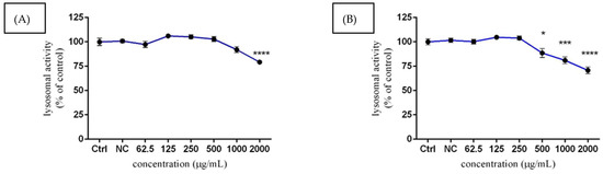 Neutral red uptake quantification was performed to identify related disruption of lysosomal activity and therefore possible cytotoxic effects of Lepidium sativum L. extract on TM3 murine Leydig cells. A significant (p < 0.001) reduction in lysosomal activity was observed only at 2000 µg/mL of experimental extract (79.27 ± 1.03%) after 24 h exposure, compared to the control group (100.00 ± 3.67%) (Figure 4A). However, loss of lysosomal activity, especially for the 1000 and 2000 µg/mL concentrations (81.02 ± 3.53% and 70.82 ± 3.43%), became more evident (p < 0.001; p < 0.0001) after 48 h treatment, compared to the untreated cells (100.00 ± 3.12) (Figure 4B). In the case of lower experimental doses of Lepidium sativum L., there were no observed significant changes after 24 h, or even after 48 h.