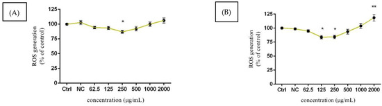 The intracellular formation of superoxide radical was evaluated using a nitroblue-tetrazolium (NBT) assay after 24 and 48 h exposure. After 24 h exposure (Figure 5A), the lower concentrations of the tested extract resulted in significant (p < 0.05) inhibition of superoxide radical production, where the value decreased by approx. 14% in comparison to the control (100.00 ± 1.52%). Similar significant (p < 0.05) tendencies were recorded at 125 µg/mL (83.83 ± 3.01%) and 250 µg/mL (84.15 ± 3.02%) after 48 h treatment (Figure 5B). In addition, a notable elevation regarding the superoxide radical production was observed in samples treated with the highest concentration (106.20 ± 4.34%). In the case of a prolonged period of exposure, the highest applied dose 2000 µg/mL of Lepidium sativum L. significantly (p < 0.01) increased the presented parameter compared to the untreated (control) cells (100.00 ± 5.98%).