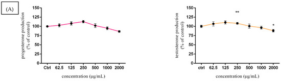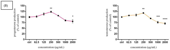 Taking into account both treatment periods (24 and 48 h), a bell-shaped dose–response curve was observed, as seen in Figure 6. A slight increase in progesterone and testosterone secretion, without significant changes was confirmed after 24 h exposure to Lepidium sativum L. Lower applied doses stimulated hormone secretion, observably at 125 µg/mL (108.20 ± 4.68%; 110.83 ± 4.46%) and 250 µg/mL (112.91 ± 3.34%; 108.40 ± 2.67%) compared to the control group (100.00 ± 1.34% vs. 3.01%). At 48 h exposure, 250 μg/mL of experimental extract caused a significant (p < 0.01) increase in progesterone (123.40 ± 3.36%) and testosterone (117.91 ± 2.61%) secretion. A higher applied dose of 2000 μg/mL (in progesterone) together with 1000 or 200 μg/mL (in testosterone) initiated a significant (p < 0.05; p < 0.001) decline compared to the control cells (100.00 ± 3.41% and 0.33%).
