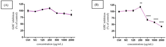 The effects of Lepidium sativum L. on GJIC inhibition after 24 h (A) and 48 h (B) exposure in vitro. Abbreviations: Ctrl—control group, NC—negative control. The data are presented as the mean (±SEM) optical density percentage of the control (untreated) and experimental extract-treated groups. The data were collected from three independent experiments performed in triplicate. Levels of significance were established at **** (p < 0.0001); ** (p < 0.01), and * (p < 0.05). Statistical differences between the values of control and treated groups are indicated by an asterisk (*).