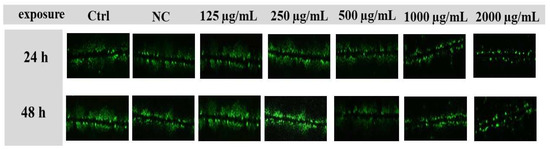Similar results to the metabolic activity assay were obtained in cell membrane integrity evaluation using the CFDA-AM method (Figure 3A) where the highest concentrations (1000 and 2000 µg/mL) of Lepidium sativum L. led to a significant (p < 0.001; p < 0.0001) decrease of cell membrane integrity (89.28 ± 2.14%; 81.68 ± 1.71%) after 24 h exposure compared to the untreated (control) cells (100.00 ± 1.48%). Similarly, significant (p < 0.0001) effects were more noticeable after prolonged exposures (82.91 ± 1.39; 79.34 ± 1.82%). In addition, the experimental concentration of 500 µg/mL caused increased cytotoxic effects, accompanied by membrane damages (89.78 ± 1.77%), with the treatment compared to control (100.00 ± 1.60%) (Figure 3B). On the other hand, lower concentrations of experimental extract did not negatively affect the cell membrane integrity, and the obtained data remained slightly above the control values.