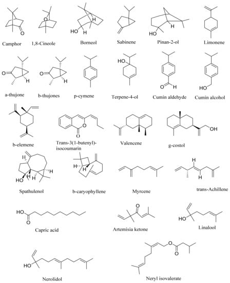 Major components of essential oils from Artemisia species of Central Asia [6,67,69,70,74,75,80,81,86,89,90,99,100,101,102,103].