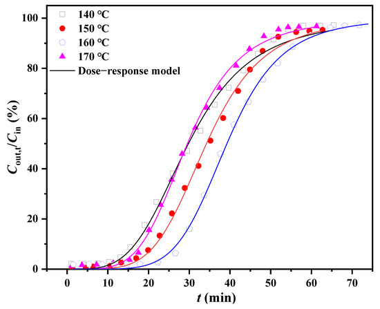 Experimental dotted lines and dose–response model fitting breakthrough curves at different bed temperatures.