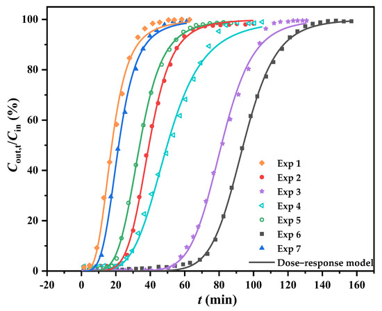 - Based on our previous work [23,29], the dose–response model (Equation (3)) was selected to fit the experimental data to more deeply understand the adsorption behavior of cumene in the SSA/MCM-41 fixed-bed column and predict the theoretical adsorption performance metrics (tB,th/min and QB,th/mg·g−1).