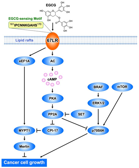 Abnormal activation of BRAF is the most frequently observed mutation event in patients with melanoma and is associated with constitutive hyperproliferation. Selective BRAF inhibition improves the outcomes of patients with mutated BRAF melanoma. Unfortunately, acquired resistance to BRAF inhibition is the problem. Therefore, there is an urgent need to identify new strategies of treatment of melanoma. EGCG (5 μM) inhibits melanoma cell growth independent of BRAF inhibitor sensitivity by regulating the activity of PP2A. Functional genetic screening identified this enzyme as a key player in lowering the growth of melanoma cells [3]. EGCG binding to 67LR elicits activation of PP2A via the adenylate cyclase (AC)/cyclic adenosine monophosphate (cAMP) axis, causing melanoma-specific mammalian target of rapamycin (mTOR) inhibition and merlin activation related to tumor suppression (Figure 2). Furthermore, the inhibition of mTOR causes strong synergism with the BRAF inhibitor in BRAF inhibitor-resistant melanoma. Additionally, Suvar3–9, an enhancer-of-zeste trithorax (SET), an oncoprotein that inhibits the activity of PP2A, is overexpressed in melanoma. EGCG (5 μM) activates PP2A and inhibits cell growth without affecting SET expression in melanoma. SET silencing significantly enhances 67LR/PP2A signaling in vivo and, consequently, the EGCG-elicited anti-melanoma activity [35]. Therefore, SET is expected to be an important target molecule for EGCG to potentiate its anti-melanoma action.