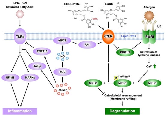 Activation of EGCG-sensing pathway following its binding to 67LR results in anti-inflammatory and anti-allergic actions. The anti-inflammatory effect of EGCG and EGCG3″Me results from inhibition of TLR signaling mediated by 67LR, Tollip, and RNF216. EGCG/EGCG3″Me binding to 67LR suppresses MRLC phosphorylation and the histamine release from basophils. EGCG/EGCG3″Me also inhibits ERK1/2 phosphorylation, reducing FcεRI expression.