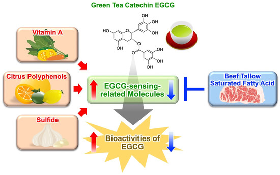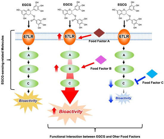 Regulation of EGCG bioactivity through modulating the behaviors of EGCG-sensing-related molecules by other food factors. Functional interaction between food factors, functional food pairing, includes both the increase and decrease in the activity and expression of EGCG-sensing-related molecules.