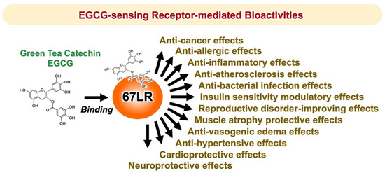 Currently, no clinical trials have established the direct relationship between 67LR and EGCG. Cohort studies and human interventional trials will provide more definitive information on the potential relationship between EGCG-sensing pathways and health-promoting properties of EGCG intake. We expect that this review will have broad implications that may be applicable to research on other dietary components.