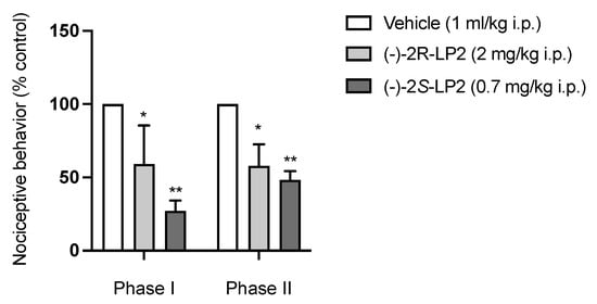 (−)-2S-LP2 decreased nociceptive behaviour in the mouse formalin test. Intraperitoneal administration of (−)-2S-LP2 (0.7 mg/kg) and (−)-2R-LP2 (2 mg/kg) were able to reduce nociceptive behaviour in both phases of the formalin test. Results are expressed as mean ± SEM (n = 6–8 mice per group) and are represented as the percentage of inhibition of pain responses of the respective vehicle group (100%). * p < 0.05, ** p < 0.01 vs. Vehicle, two-way ANOVA followed by Bonferroni post-hoc test.