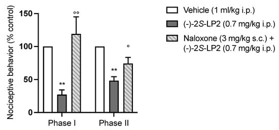 The antinociceptive effect of (−)-2S-LP2 was antagonized by naloxone pre-treatment. Subcutaneous administration of naloxone hydrochloride (3 mg/kg) 20 min before (−)-2S-LP2 reverted its effect in the formalin test. Results are expressed as mean ± SEM (n = 6–8 mice per group) and are represented as the percentage of inhibition of pain responses of the respective vehicle group (100%). °° p < 0.01 vs. (−)-2S-LP2, ° p < 0.05 vs. (−)-2SLP2, ** p < 0.01 vs. Vehicle, two-way ANOVA followed by Bonferroni post-hoc test.