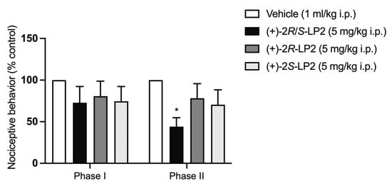 (+)-2R/S-LP2 reduced nociceptive behaviour in the mouse formalin test. Intraperitoneal administration of (+)-2R/S-LP2 (5 mg/kg) was able to decrease nociceptive behaviour only in the second phase of the mouse formalin test, while intraperitoneal administration of (+)-2R-LP2 (5 mg/kg) and (+)-2S-LP2 (5 mg/kg) did not differ significantly from the vehicle. Results are expressed as mean ± SEM (n = 6–8 mice per group) and are represented as the percentage of inhibition of pain responses of the respective vehicle group (100%). * p < 0.05 vs. Vehicle, two-way ANOVA followed by Bonferroni post-hoc test.