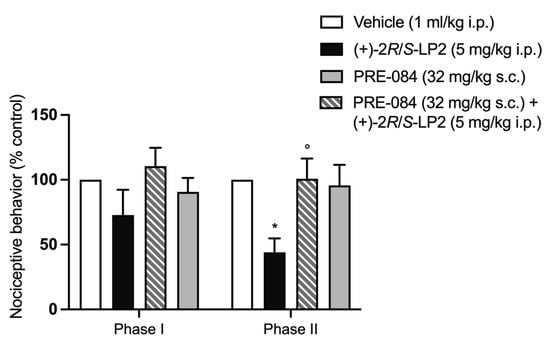 The antinociceptive effect of (+)-2R/S-LP2 was antagonized by PRE-084 pre-treatment. Subcutaneous administration of PRE-084 hydrochloride (32 mg/kg) 20 min before (+)-2R/S-LP2 reverted its effect in the second phase of the formalin test. Results are expressed as mean ± SEM (n = 6–8 per group) and are represented as the percentage of inhibition of pain responses of the respective vehicle group (100%). ° p < 0.05 vs. (+)-2R/S-LP2, * p < 0.05 vs. Vehicle, two-way ANOVA followed by Bonferroni post-hoc test.