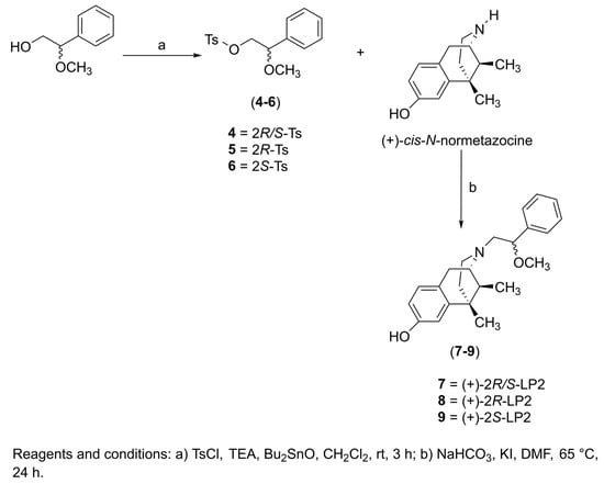 Based on these findings, the aim of our work was to evaluate the opioid and/or σ1R functional profile of N-normetazocine-based ligands as potential therapeutic agents for inflammatory pain management. Previously, we synthesized the (−)-2R-LP2 (2) and (−)-2S-LP2 (3) isomers (Figure 1) characterized by a peculiar in vitro and in vivo profile [30]. In the present work, to investigate the pivotal role of N-normetazocine stereochemistry in their pharmacological fingerprint, we also synthesized the (+)-2R/S-LP2 (7), (+)-2R-LP2 (8), and (+)-2S-LP2 (9) compounds (Scheme 1).