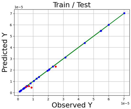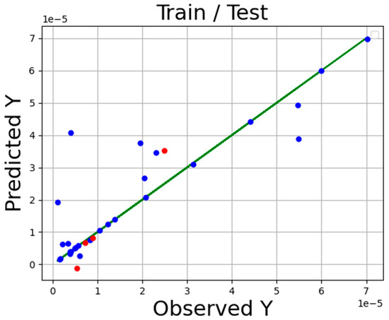 The accuracy of the final models is presented in Table 2 Additionally, the comparison of expected and estimated values of tamoxifen solubility in SC-CO2 system via ADA-KNN, ADA-GPR, and ADA-TSR models is shown in Figure 1, Figure 2 and Figure 3. In these diagrams, the green line is the actual data line, and the point is predicted values blue for train sunset and red for test subset. Comparing these three charts proves that the ADA-KNN is the most general and appropriate model since the points are near actual test and train data lines.