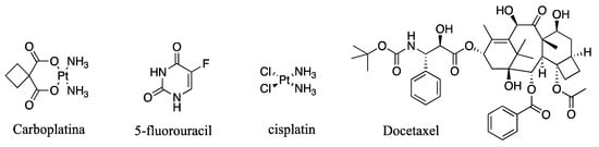 According to the stage of the disease, the approaches used in the clinic are radiotherapy, surgery, and/or chemotherapy [3,4]. The most common chemotherapeutic agents for OSCC include carboplatin, 5-fluorouracil, cisplatin, and docetaxel (Figure 1), alone or in combination, but they lead to important side effects, such as diarrhea, nerve damage, and kidney damage [5]. Thus, the discovery and development of new antineoplastic drugs are essential to improve disease prognosis and reduce toxicity.
