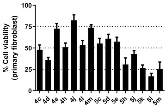 The Selective Index (SI) represents the degree of selectivity of investigated molecules. A SI value ≥ 2 indicates selective toxicity towards cancer cells, while an SI value < 2 is considered generally toxic, meaning that it can also cause cytotoxicity in normal cells [18,19,20]. Primary human gingival fibroblasts were treated with 2 × IC50 (two times the calculated IC50) of each compound, and the ones that surpassed 75% of cell viability (4e, 4j, and 4m) (Figure 2), suggesting an SI > 2, were selected to have their IC50 calculated in fibroblasts and to be tested on two other OSCC cell lines, SCC4 and SCC25, which are less sensitive to antitumor agents.