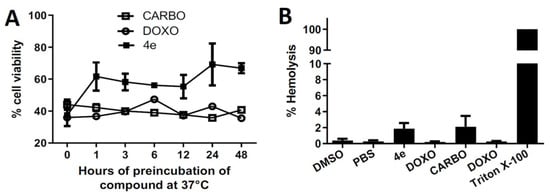 It is desired that studied compounds present relative biological activity stability at 37 °C as the drugs already in use. To evaluate the biological activity stability of the new compound, 4e or the control were pre-incubated for different time intervals at 37 °C (0, 1, 3, 6, 12, 24, and 48 h) and further tested for 48 h for their cytotoxicity against SCC9 cells. The results showed that, after the first hour, compound 4e is biological stable in a similar fashion as carboplatin (Figure 3A) with little variation in the cytotoxicity; however, further analysis is needed to determine if the compound is chemically stable.