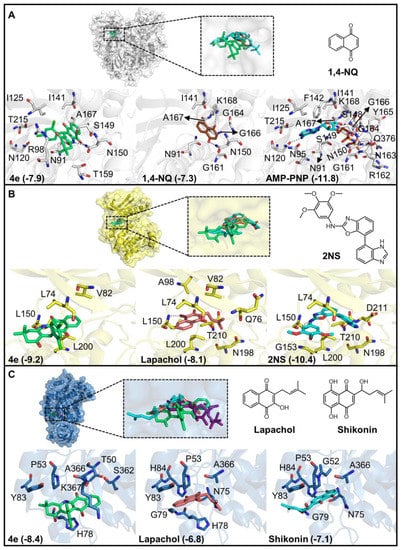 Docking of compound 4e with its putative anticancer targets and comparison with the known inhibitors. Superimposition and interaction pattern of (A) 4e (green), 1,4-naphthoquinone (1,4-NQ; brown), and AMP-PNP (cyan) with the ATPase domain of topoisomerase IIα; (B) 4e (green), lapachol (pink), and 2NS (cyan) with RSK2; (C) 4e (green), lapachol (pink), and shikonin (cyan) with PKM2. The ATP bound to the rabbit PKM2 is also shown in purple in the superimposition. Hydrogen bonds and salt bridges are shown as dashed lines. The predicted binding energies of the compounds with the respective enzymes are shown in parenthesis (in Kcal/mol). The binding energies of the co-crystallized inhibitors were calculated by redocking studies.