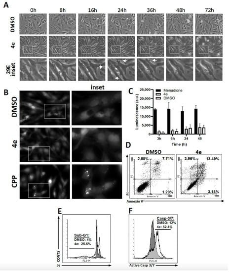 In order to better investigate the cytotoxic process and exclude other pathways, we tested the possibility of cell death induced by autophagy. For that, we used SCC9 cells expressing the microtubule-associated protein 1A/1B-light chain 3 (LC3) fused with GFP protein. LC3 is a protein that, during autophagy, is recruited to autophagosomes which can be visualized as punctas in microscopy. As seen in Figure 6B, while calcium phosphate precipitate (CPP), an autophagy inducer [45] induces an LC3-GFP puncta formation indicative of autophagy, neither DMSO nor 4e were able to induce this cell death process.