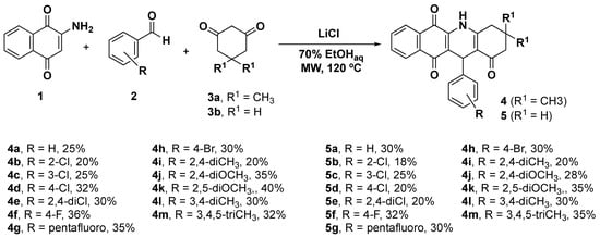 We performed the multicomponent synthesis of compounds 4 and 5 through a reaction between 2-amino-1,4-naphthoquinone (1) [12], substituted benzaldehydes (2), and 5,5-dimethyl-1,3-cyclohexanedione (dimedone, 3a) or 1,3-cyclohexanedione (3b) in the presence of lithium chloride and a water/ethanol mixture as a solvent in a microwave reactor (Scheme 1). The synthesis of acridines was achieved in satisfactory yields as racemic mixtures, and their structures were confirmed by IR, NMR, and high-resolution mass spectrometry (See Supplementary Spectral Data SI).