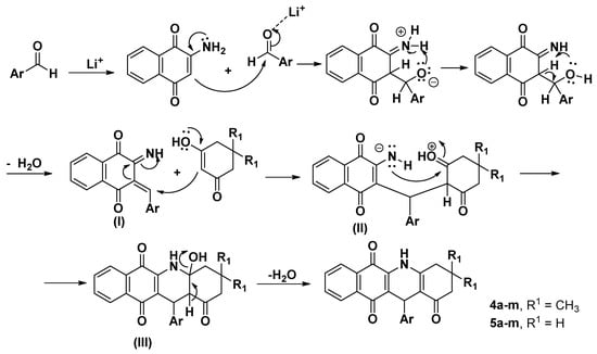 The proposed mechanism for this reaction is shown in Scheme 2 and occurs through nucleophilic attack on the carbonyl of the aldehyde by the C-3 carbon of 2-amino-1,4-naphthoquinone forming intermediate I, which will react with enol II of the 1,3-dicarbonylated compound to give intermediate III which upon dehydration will yield the condensation product 1,4 (4 and 5).