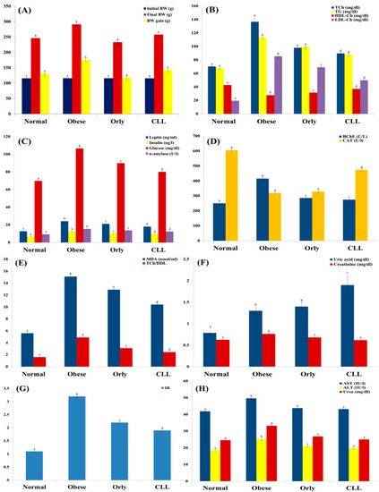 Body weight and biochemical parameters in the 4th week of treatment of experimental animals with Orly and CLL compared to normal and obese groups. (A) The initial, final body weights (BW) and BW gain (g). (B) The level of plasma total cholesterol (TCh mg/dL), triglycerides (TG mg/dL), high-density lipoprotein cholesterol (HDL-Ch mg/dL), and low-density lipoprotein cholesterol (LDL-Ch mg/dL). (C) The level of leptin (ng/mL), insulin (μg/L), glucose (mg/dL), and α-amylase (U/L). (D) The level of plasma butyrylcholinesterase (BChE (U/L)) and plasma catalase activity (CAT (U/L)). (E) The level of malondialdehyde (MDA (nmol/mL) and TCh/HDL. (F) The level of plasma uric acid (mg/dL) and plasma creatinine (mg/dL). (G) Calculated insulin resistance (IR). (H) The activity of aspartate transaminase (AST (IU/L)), alanine transaminase (ALT (IU/L)), and urea (mg/dL). Each bar graph represents the mean replicate measurement (n = 6) expressed as mean ± S.E. The bar graphs with a similar lower-case letter (such as ‘a’) among experimental groups are not significantly different from each other (p > 0.05). The bar graphs with different lower-case letters (such as a, b, c, d, and e) are statistically different from each other (p < 0.05).