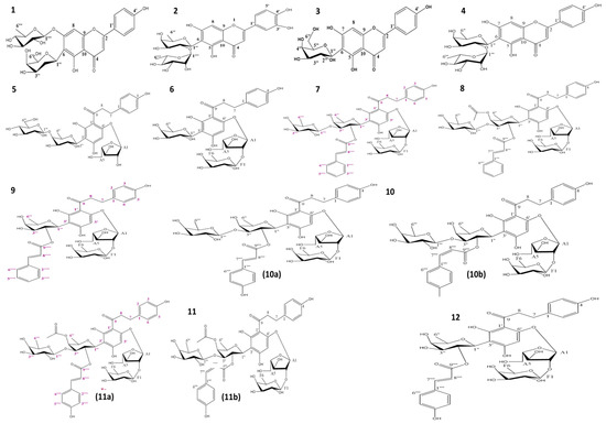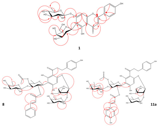 New compounds for the first time to be identified in nature, including compounds 1, 8, 11a, and 11b, are discussed in detail in this section. All spectral data are provided in supplementary file. Compound 1 (Figure 2) was isolated as a yellowish amorphous powder soluble in 100% MeOH. The molecular formula of compound 1 was calculated as C27H30O13, based on a deprotonated ion peak calculated at m/z 561.16137, detected at m/z 561.1614 [M-H]− (calculated C27H29O13−, error −0.1 ppm) in the HR-ESI-MS spectrum (Figure S1). Compound 1 showed two UV maximums (λmax) (MeOH) at 270 nm (Band II) and 334 nm (Band I), characteristic for a flavone skeleton [27]. The IR spectrum of compound 1 illustrated a broad band at 3431.4 cm−1 and 1623 cm−1, consistent with the presence of hydroxy group and carbonyl functions [28].