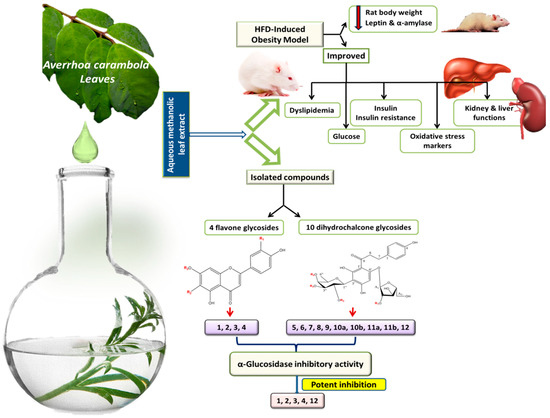 Multiple chromatographic approaches of the leaf extract led to the isolation of 14 compounds, including 4 flavone glycosides (1–4) and 10 dihydrochalcone glycosides (5–12) with two non-separable mixtures, including four newly described compounds, i.e., 1, 8, 11a, and 11b were reported for the first time in the literature. Further, in vitro α-glucosidase inhibitory activity assessment of isolated compounds revealed the strong potency of isolated flavone glycosides, viz., compounds 1, 2, 3, and 4, as α-glucosidase inhibitors, compared to dihydrochalcone glycosides, except for compound 12. These results suggest for the role of flavone glycosides in alleviation of the major obesity comorbidity, i.e., diabetes via α-glucosidase inhibition, and has yet to be confirmed for other action mechanisms. An extended approach utilizing detailed studies on the molecular mechanisms of A. carambola leaf effect should now follow, together with subclinical and clinical trials on leaf crude extract, to be more conclusive, especially considering the known negative impact of its fruit on kidney functions. Moreover, assessment of the isolated phytoconstituents for their anti-obese activity using in vivo model or targeting other enzymes, i.e., lipases, etc., should now follow to correlate for the extract’s potential anti-obesity effect. This study poses A. carambola leaf as a new anti-obesity functional food and adds to its effects aside from its fruit’s more explored uses.