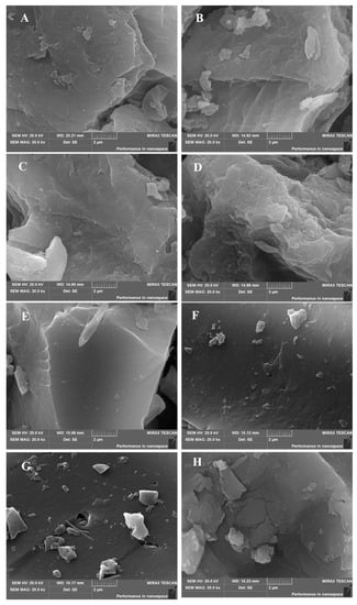 SEM images of BC samples: (A) CPP200; (B) CPP250; (C) CPP300; (D) CPP350; (E) CPP400; (F) CPP450; (G) CPP500; (H) CPP200, post-adsorption of MB.