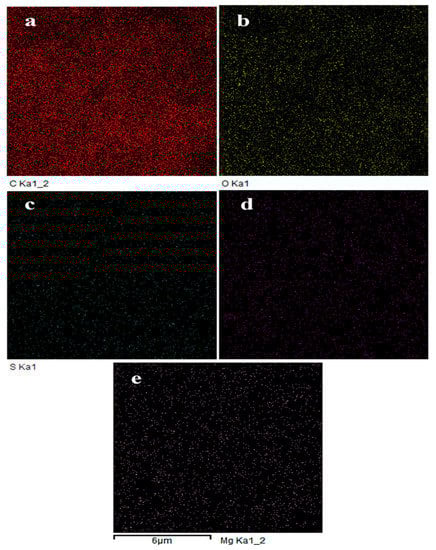 Elemental mapping of CPP200: (a) C; (b) O; (c) S; (d) Ca; and (e) Mg.