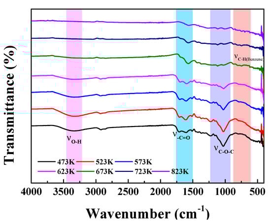 FT−IR spectra of BCs prepared using different pyrolysis temperatures.