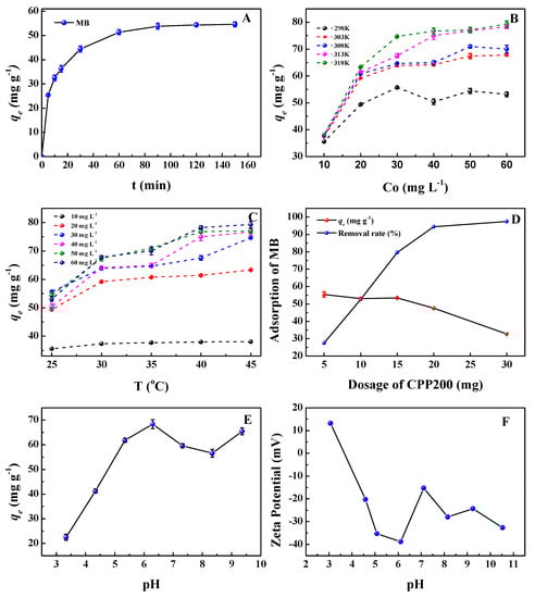 Adsorption properties of CPP200 for MB. (A) Effect of contact time (C0 = 50.0 mg/L, T = 25 °C, pH = 7.32); (B,C) effects of initial MB concentration and temperature (t = 90 min, pH = 7.32); (D) effect of CPP200 dosage (C0 = 50.0 mg/L, t = 90 min, pH = 7.32); (E) effect of initial MB pH (C0 = 50.0 mg/L, t = 90 min, T = 25 °C); (F) zeta potential of CPP200 in aqueous solution at different pH values.