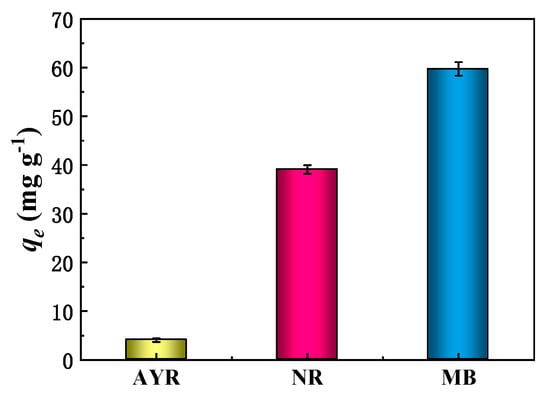 The adsorption experiments were carried out by adding 5.0 mg of BC into a conical flask (100 mL) that contained 20.0 mL of dye solution with the desired concentrations. The adsorption of the dye solution both pre- and post-adsorption was measured using a 752 UV-Vis spectrophotometer (Shanghai Jinghua Technology Instrument Co., Ltd., Shanghai, China) in a wavelength-specific manner (664 nm for MB, 370 nm for AYR and 542 nm for NR) at room temperature, and dye concentrations were calculated through the calibration equations.