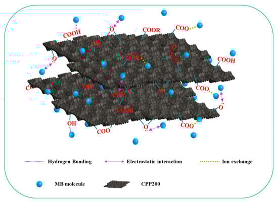 Previous research reported that the adsorption of MB by activated carbon was seriously affected by the electrostatic interactions between the adsorbent and adsorbate [59]. An effect of pH on the adsorption process indicated that electrostatic interactions dominated the adsorption of MB by CPP200. Under low pyrolysis temperatures (≦350 °C), the adsorption capacities of BCs toward MB were affected by the oxygen-containing functional groups which were responsible for the negative charges of BCs [60]. In addition, hydrogen bonds between MB and different oxygen-containing functional groups such as -COOH and –OH in BCs that were prepared at low temperatures were formed [61,62]. The intermolecular π-π interactions may be caused by the π electrons and the aromatic/heterocyclic rings of MB and CPP200. Obviously, the π-π interactions tended to increase with an increase in pyrolysis temperature [63]. As a result of stronger electrostatic interactions, hydrogen bonding and ion exchange dominated the adsorption capacity of CPP-derived BCs, the π-π interactions could consequently be ignored or excluded [64].