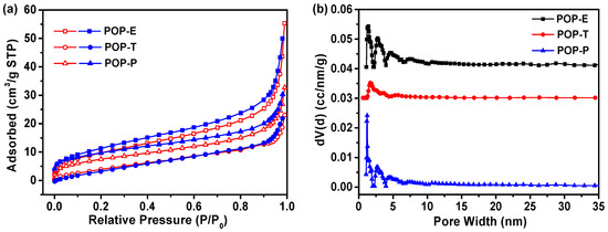 (a) Nitrogen adsorption/desorption isotherms of POP-E, POP-T and POP-P. (b) Pore size distributions of POP-E, POP-T and POP-P.