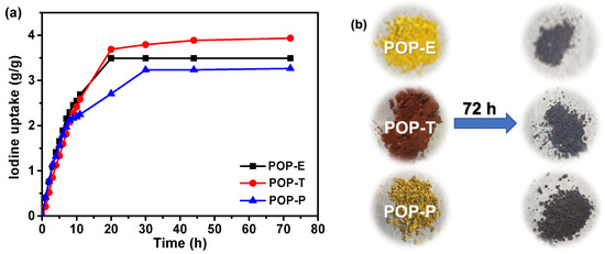 It can be seen from the iodine adsorption curve (Figure 3) that the iodine was rapidly adsorbed by POPs at 75 °C within the initial 20 h, which could be attributed to the hierarchical porous structure of the porous material [51]. Among the three POPs, POP-T showed the best iodine vapor uptake ability. After 30 h, the weight growth of the three POPs gradually slowed down, indicating that the adsorption of iodine vapor was close to saturation. Based on these observations, the iodine vapor adsorption experiments of the POPs were continued for another 42 h. It was found that when the adsorption time reached 72 h, the weight of POPs no longer changed obviously, indicating that the iodine uptake of POP-E, POP-T and POP-P was completely saturated. Meanwhile, the colour of the three POPs turned black after the saturated adsorption of iodine, which was related to the deposition of iodine on the surface of the POPs and suggested the high uptake degree of iodine. After calculation, the iodine adsorption capacity of POP-E, POP-T and POP-P was 3.49, 3.94 and 3.27 g·g−1, respectively, indicating that all three POPs have good iodine adsorption capacity.