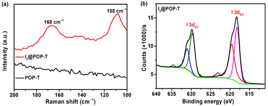 (a) Raman spectra of POP-T and I2@POP-T and (b) XPS spectrum of I2@POP-T.