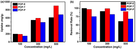 In addition, we investigated the iodine adsorption capacity of POP-E, POP-T and POP-P in a solution environment. The adsorption experiment of iodine was carried out in n-hexane (details are given in Sections S3 and S6 in the Supplementary Materials). The experimental results showed that all three POPs exhibited good iodine removal rates in n-hexane solution at different concentrations. Their iodine uptake capabilities were 199.7, 193.4 and 150.7 mg·g−1 for POP-E, POP-T and POP-P, respectively, when the concentration of iodine in n-hexane was 100 mg·L−1. The values were 546.1, 594.0 and 489.7 mg·g−1 and 610.5, 902.8 and 682.3 mg·L−1 when the concentration of iodine in n-hexane was 300 and 500 mg·L−1, respectively (Figure 6a). The removal efficiencies of POP-E, POP-T and POP-P were 99.9%, 96.7% and 75.3% in 100 mg·L−1 iodine-n-hexane solution: 91.0%, 99.0% and 81.6% in 300 mg·L−1 iodine-n-hexane solution and 61.1%, 90.3% and 68.2% in 500 mg·L−1 iodine-n-hexane solution, respectively (Figure 6b). Obviously, POP-T has the best iodine adsorption capacity in n-hexane among the three POPs, which is consistent with the adsorption performance of iodine vapor (Figure 6). The iodine adsorption curves of three POPs were determined in 300 mg· L−1 iodine-n-hexane solution monitored by UV/ Vis spectra (Figure S17). Due to the effect of solvent encapsulation, the adsorption capacity of POPs in iodine solution was lower than their adsorption capacity for iodine vapor.