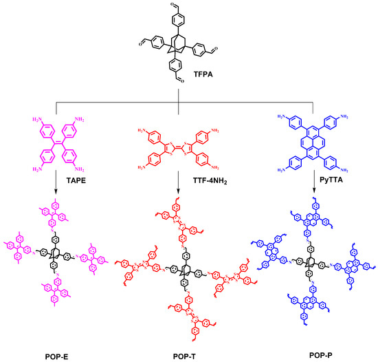 The synthesis route of POP-E, POP-T and POP-P was shown in Scheme 1. The three POPs were constructed through the Schiff base condensation reaction in the presence of 1,2-dichlorobenzene and acetic acid at 120 °C. The synthesis details of the monomers and the corresponding 1H NMR results (Figure S1–S7) are given in supporting information (SI). The successful formation of POPs (POP-E, POP-T and POP-P) was confirmed by Fourier transform infrared spectroscopy (FT-IR) using an attenuated total reflection (ATR) mode (Figure 1). For the FT-IR spectra of tetrakis (4-aminophenyl) ethene (TAPE), 4,4’,4’’,4’’’-([2,2’-bi(1,3-dithiolylidene)]-4,4’,5,5’-tetrayl)tetraaniline (TTF-4NH2) and 1,3,6,8-tetrakis (4-aminophenyl) pyrene (PyTTA) monomers, the absorption bands between 3400 and 3200 cm−1 are due to the N-H stretching vibration. The absorption peaks around 1700 cm−1 can be ascribed to the -C=O stretching vibration. After the Schiff-base condensation reaction, the absorption bands between 3400 and 3200 cm−1 almost disappeared in the FT-IR spectra of POP-E, POP-T and POP-P, indicating a high degree of polymerization between the amine and aldehyde groups of the monomers. Meanwhile, several new absorption peaks appeared after the reaction between the two units. The peaks at 1663 cm−1, 1624 cm−1 and 1623 cm−1 represented the imine bonds for POP-E, POP-T and POP-P, respectively. It is worth noting that there were still characteristic absorption peaks of the aldehyde group existing in the three POPs, which suggests incomplete reaction between the amine and aldehyde groups.