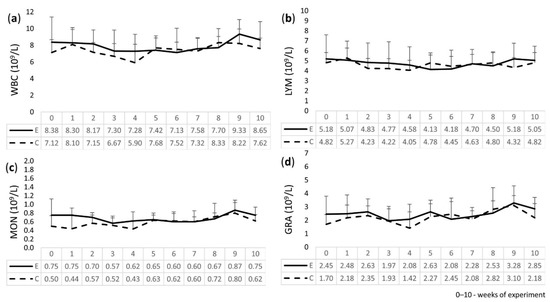 The results of the WBC, LYM, MON, and GRA analyses in the calves, as shown in Figure 1, revealed that all results were within the reference ranges [26] and no statistically significant differences were found between the E and C groups for all examined parameters, but slight differences were observed. Namely, there was a smaller decrease in the values of the WBC, LYM, MON, and GRA counts in the E group, and they were more normalized and higher in weeks 9 and 10 of the experiment when compared to the C group.