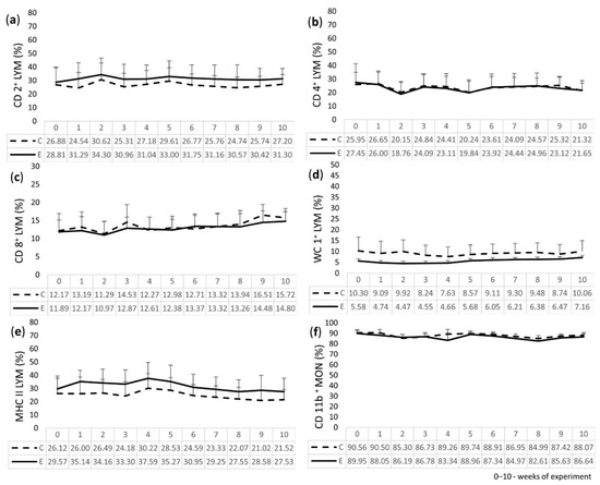 The results of cytometric analysis of the peripheral blood LEU of the calves are presented in Figure 2. For the E group, the percentage of CD2+ and MHC II (expressed on T LYM) was higher than for the C group throughout the experiment. WC1+ (gamma/delta T LYM) for the E group had lower values than those obtained for the C group, but it slightly increased throughout the time of the experiment. Regarding CD4+ (T helper LYM) and CD11b+ on peripheral blood MON, the values for the E group were similar to the C group, with the exception of lower values for CD4+ in week 9 and for CD11b+ in week 4. The percentage of CD8+ (T cytotoxic/suppressor LYM) for the E group was lower, with the exception of weeks 4 and 7, when the values were close to the C group, and week 6, when the value was higher. During the experiment, a tendency to decrease the percentage of CD4+ cells and to increase the percentage of CD8+ cells was observed for both groups. No statistically significant differences in the examined parameters were found between the E and C groups during the 10 weeks of the study.