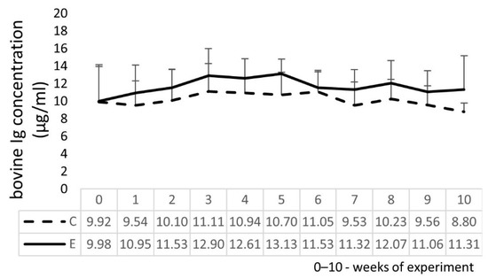 The E group had a higher concentration of serum bovine Ig when compared to the C group (Figure 3), beginning from week 1 of the experiment until the end of the study. During the study, no changes in interferon γ (IFN γ), interleukin 1β (IL 1β), and tumor necrosis factor α (TNF α) concentrations were found, and they remained at zero levels in both the E and C groups of calves. The serum interleukin 2 (IL 2) concentration in three of six animals from the E group slightly increased from zero to the range of 109.4 pg/mL to 260.2 pg/mL from week 8 to 10, while the C group remained at zero value. Similarly, the interleukin 4 (IL 4) concentration in three of six animals from the E group had concentrations in the range of 32.9 pg/mL to 43.4 pg/mL in weeks 5 and 8, while IL 4 was not detected in the serum samples in the remaining weeks of the experiment. The interleukin 10 (IL 10) concentration in three of six E calves had concentrations in the range of 25.2 pg/mL to 64.0 pg/mL from week 7 to 10, while, in the remaining weeks of the experiment, IL 10 was not detected. The differences in the values between the E and C groups were not statistically significant (p > 0.05).
