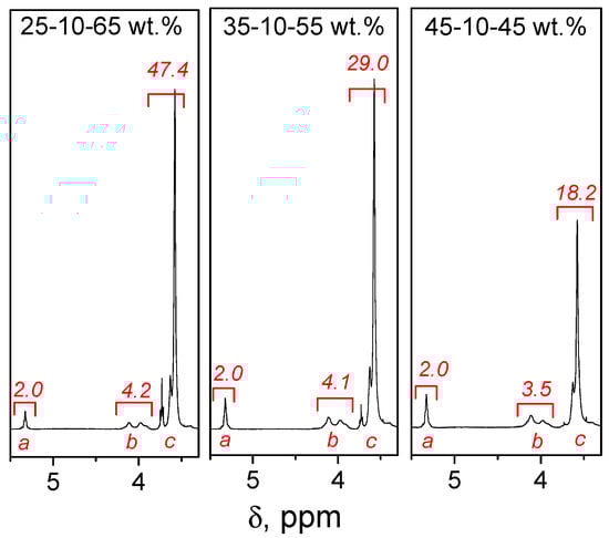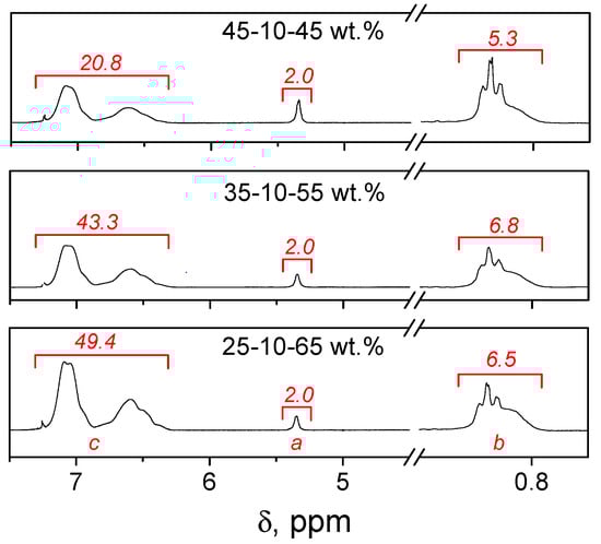 The polymer composition is a significant parameter determining the properties of the terpolymer and, ultimately, its practical applications. The Alfrey–Goldfinger equations were used to estimate the compositions of the biobased terpolymers [23,24]. The resulting copolymers’ compositions were determined by 1H NMR spectroscopy, which is routinely used for the characterization of multicomponent polymers. The technique works best when the individual monomers exhibit well-defined signals unique to the specific monomer so that the accuracy of the signal integration is reliable. However, some uncertainty may arise when signals for individual monomers overlap. According to data in the literature for individual monomers 1H NMR spectra integrals, the molar fraction of BA/MMA/St, can be evaluated from 1H NMR-based integrated areas for the signals designated on the spectrum for -O-CH2- of BA (at 4.1–3.8 ppm, 2H), for -O-CH3 of MMA (at 3.75–3.3 ppm, 3H), and for “aromatic hydrogens“ of St (spectral area for 6.2–7.5 ppm, 5H) [25].