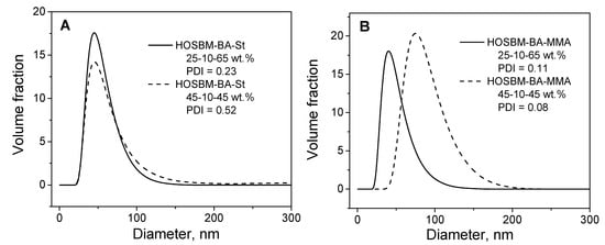 Latex particle size distribution of the biobased terpolymers HOSBM-BA-St (A) and HOSBM-BA-MMA (B).
