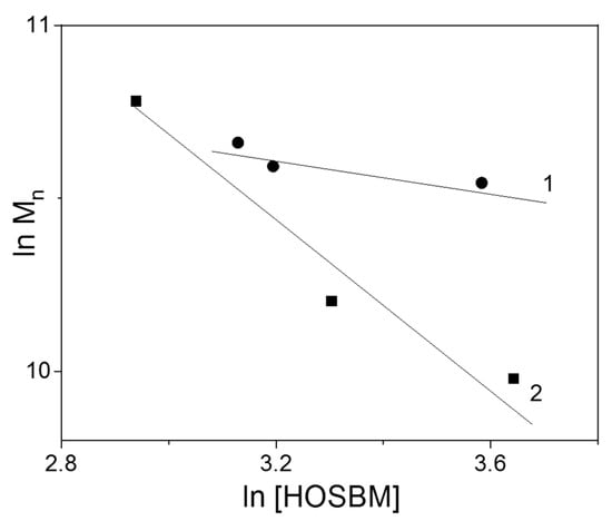 In this work, obtained latexes were characterized by gel permeation chromatography (GPC) to evaluate their molecular weight and dispersity. Figure 4 shows the logarithmic dependence of number average molecular weight on the concentration of HOSBM (ln [HOSBM]) in monomer feed.
