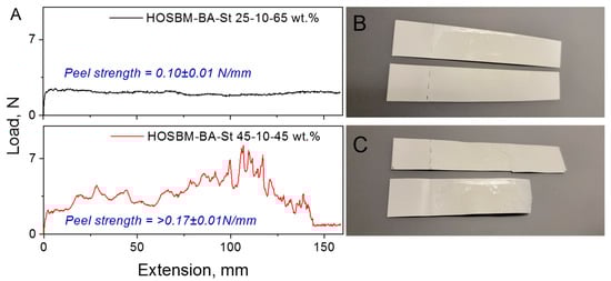 Typically, adhesion force is determined by wettability and the resulting physicochemical interactions between adhesive and substrate, including strong covalent bonding as well as weaker physical (van der Waals or hydrogen) interactions [24]. Considering the chemical structure of plant oil-based monomers, it can be assumed that the presence of oil-derived unsaturated fatty acid fragments in latexes may provide cross-linking sites, thus strengthening adhesion forces. Figure 6A shows two selected plots for HOSBM-BA-St latexes with different biobased content tested by T-peel test on paperboard (coated to uncoated) substrates. As seen qualitatively, cohesive failure was observed for latex with lower HOSBM content (Figure 6B), while the presence of 45 wt. % biobased content in the material resulting in higher peel strength and substrate failure during the testing (Figure 6C). In the case of cohesive failure, the peel plot stayed at a plateau during testing, and both substrates contained adhesive residues after the experiment ended. The peeling plot looked more complex for the latexes with higher biobased content. The load initially rose to a maximum point, then dropped to a lower value, corresponding to the noticeable delamination of the substrate (Figure 6C).