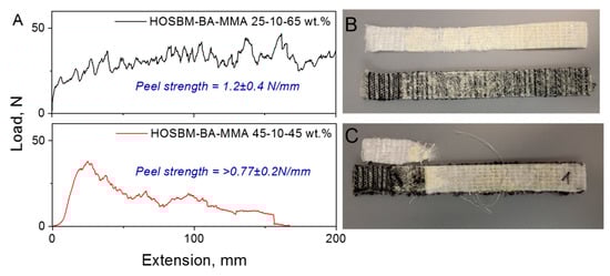 Peel strength of HOSBM-BA-MMA 25–10–65 wt. % and 45–10–45 wt. % latexes copolymers on PET-PP substrates (A) and substrates samples after T-peel strength testing ((B,C) [substrate failure]).
