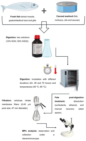 - Dehaut, A.; Cassone, A.L.; Frere, L.; Hermabessiere, L.; Himber, C.; Rinnert, G.; Rivière, G.; Lambert, C.; Soudant, P.; Huvet, A.; et al. Microplastics in seafood: Benchmark protocol for their extraction and characterization. Environ. Pollut. 2016, 215, 223–233. [Google Scholar] [CrossRef]