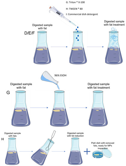 | F | Commercial dish detergent | 2% of sample volume | Fresh high-fat fish (muscle and GIT); canned oil, canned sauce |